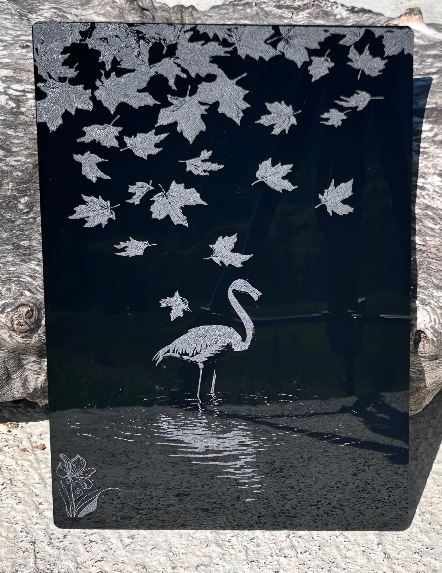 Tableau en acrylique noir gravé, feuillage avec flamant rose.